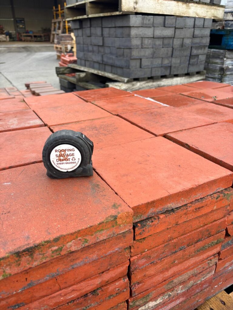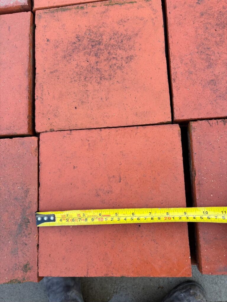 You are viewing this great batch of 175 red 9″ x 9″ by just over 1 ” thick quarry tiles salvaged from a local property just down the road from our yard.