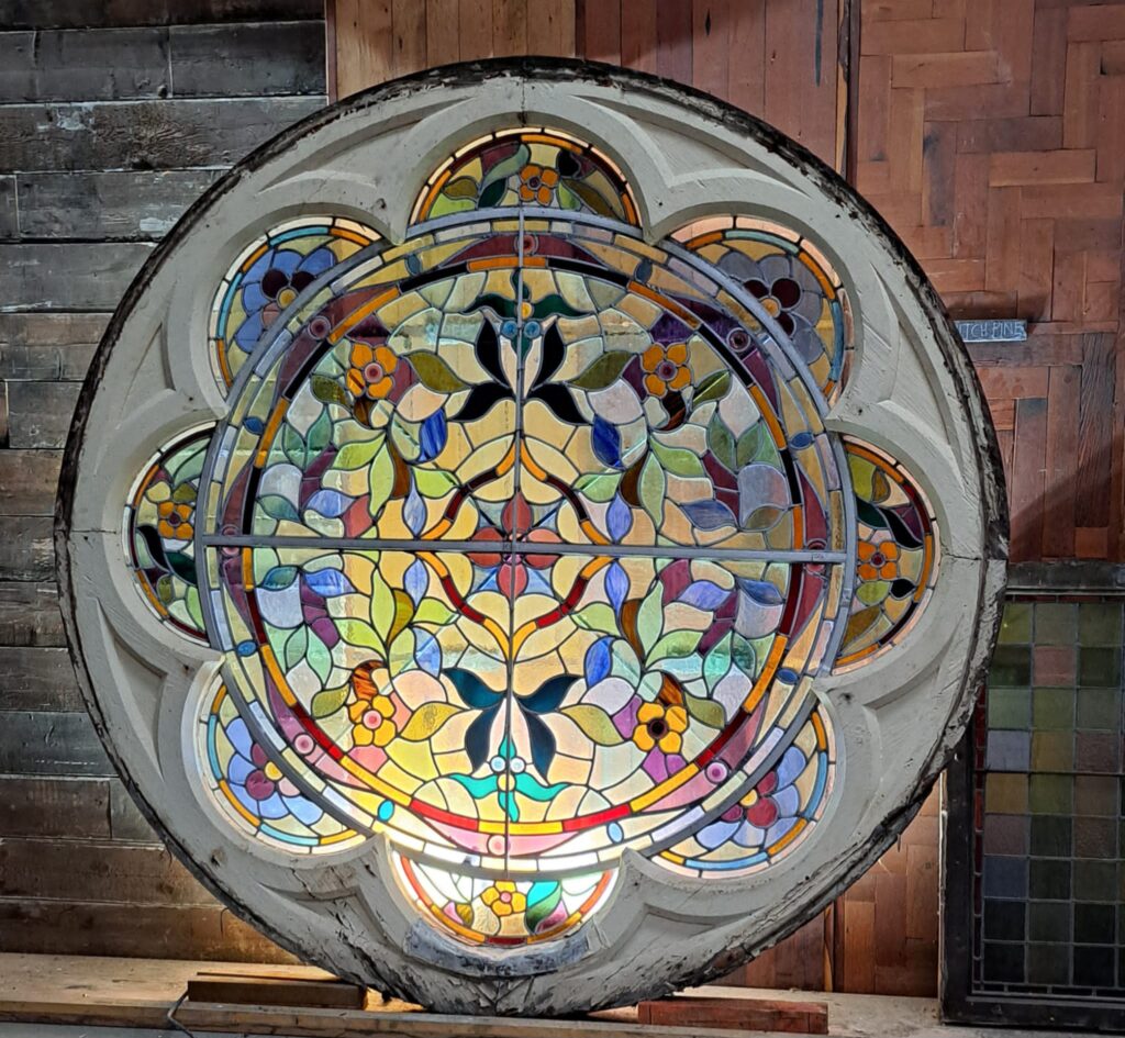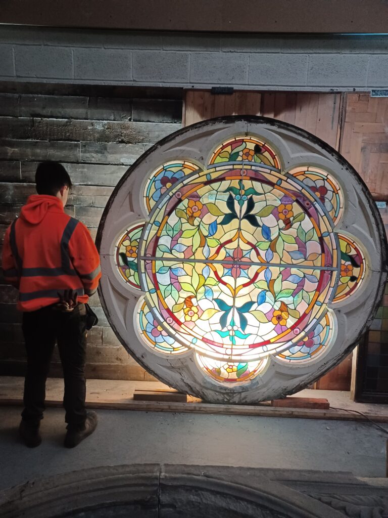 The window and the surround have both been set up in our warehouse so do pop in and have a look if need be. We have many other items from the same chapel as it is being demolished.