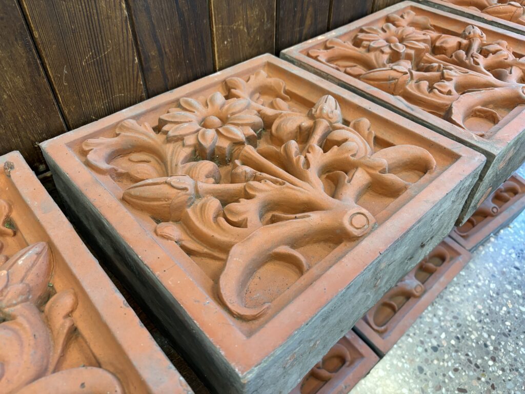 All 9 of the decorative clay plaques are in excellent condition with only a very small chip or original small firing crack.  They all measure the same size by around 13 inches square.  There is a light grey dusting to some of them which is some of the grey lime mortar dust that could be washed off.